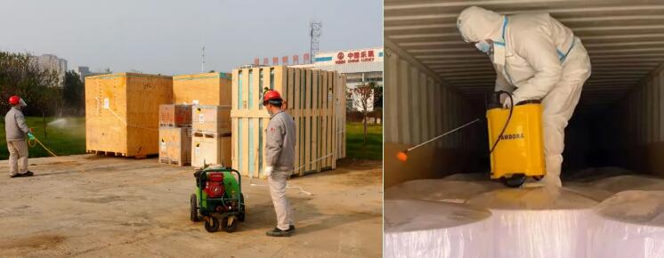 中國樂凱集團公共事業(yè)部嚴格落實防疫要求,進口到貨采取“多重消毒”,即進口集裝箱進入卸料區(qū)后,由消毒人員對車輛和集裝箱進行整體的外部消毒;打開集裝箱箱門后,消毒人員進入集裝箱,對箱內(nèi)貨物進行二次消毒